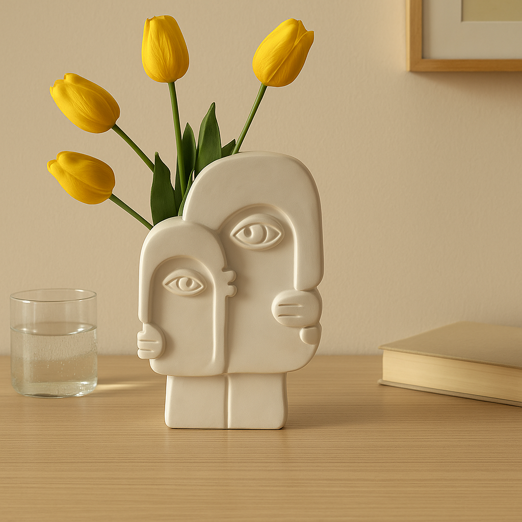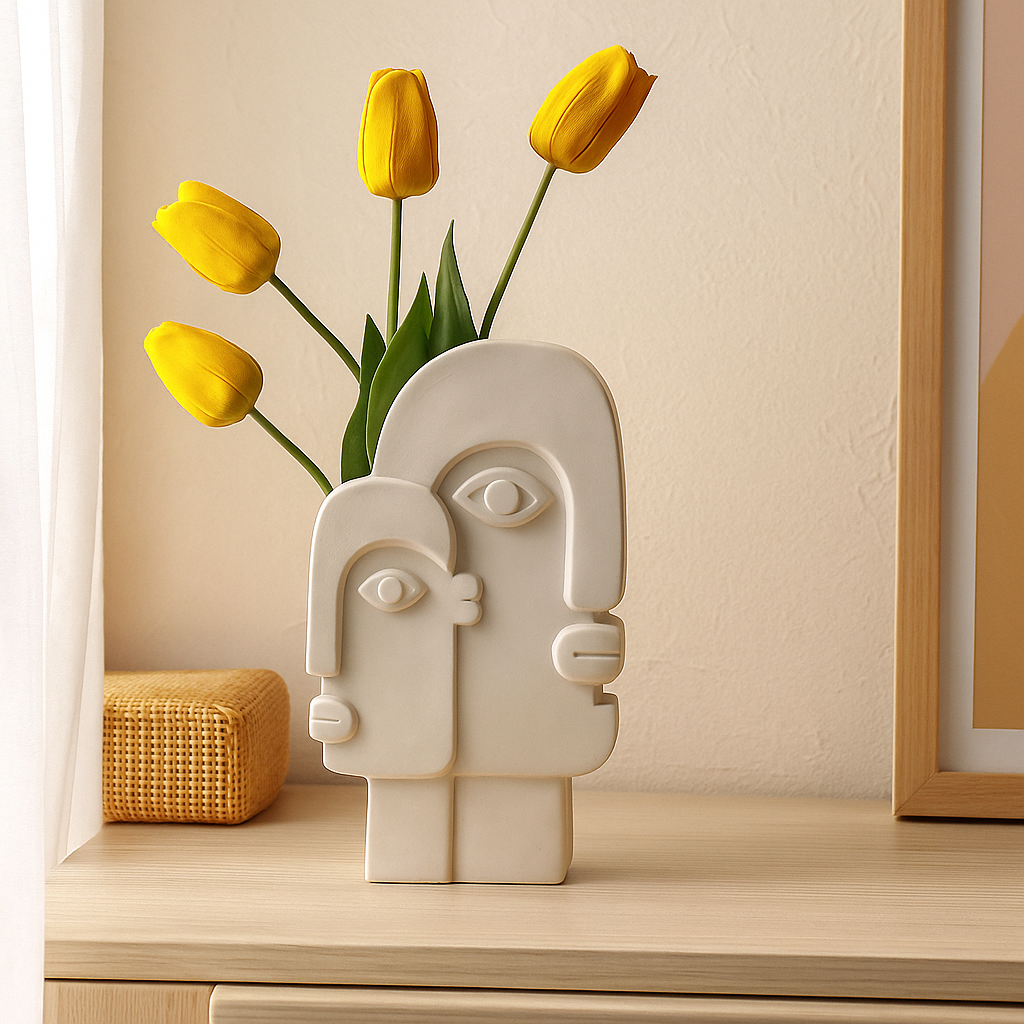Legg til et kreativt preg i hjemmet ditt med Artiface skulpturell keramisk vase – et raffinert dekorativt stykke som kombinerer abstrakte ansiktstrekk med en elegant, moderne silhuett. Denne skulpturelle vasen er designet for å skille seg ut på hyller, skjenker eller salongbord, og bringer samtidskunst inn i ethvert rom uten å overskygge det.