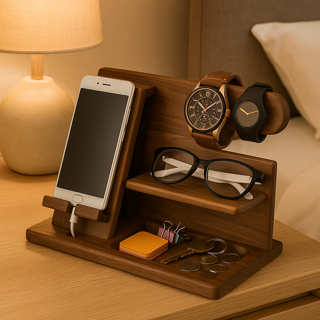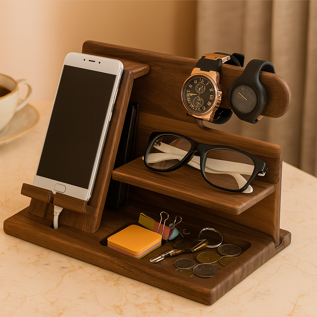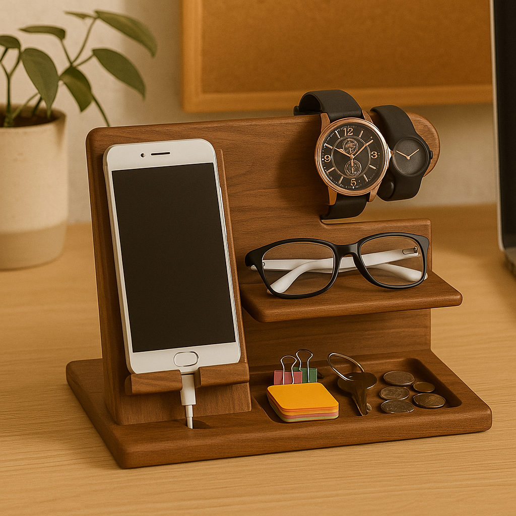 DeskMate Dock er alt-i-ett-stasjonen i tre, designet for å bringe orden til arbeidsplassen din. Med dedikerte spor for telefon, klokke, nøkler, lommebok og mer, holder denne kompakte løsningen det viktigste samlet på ett stilig sted – enten på kontoret eller hjemme.