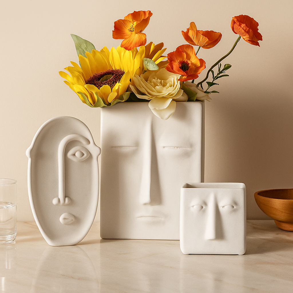 Vi introduserer FaceForm Skulptural Gulvvase, en slående blanding av moderne design og kunstnerisk uttrykk. Denne gulvvasen har et skulpturelt ansikt som gir et dristig, moderne preg til ethvert oppholdsrom. Den unike formen fungerer både som en praktisk beholder for blomsterarrangementer og som et kunstverk i seg selv.
