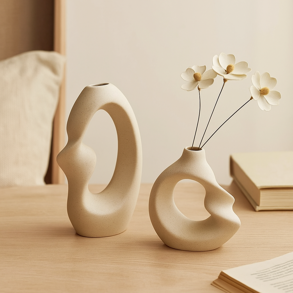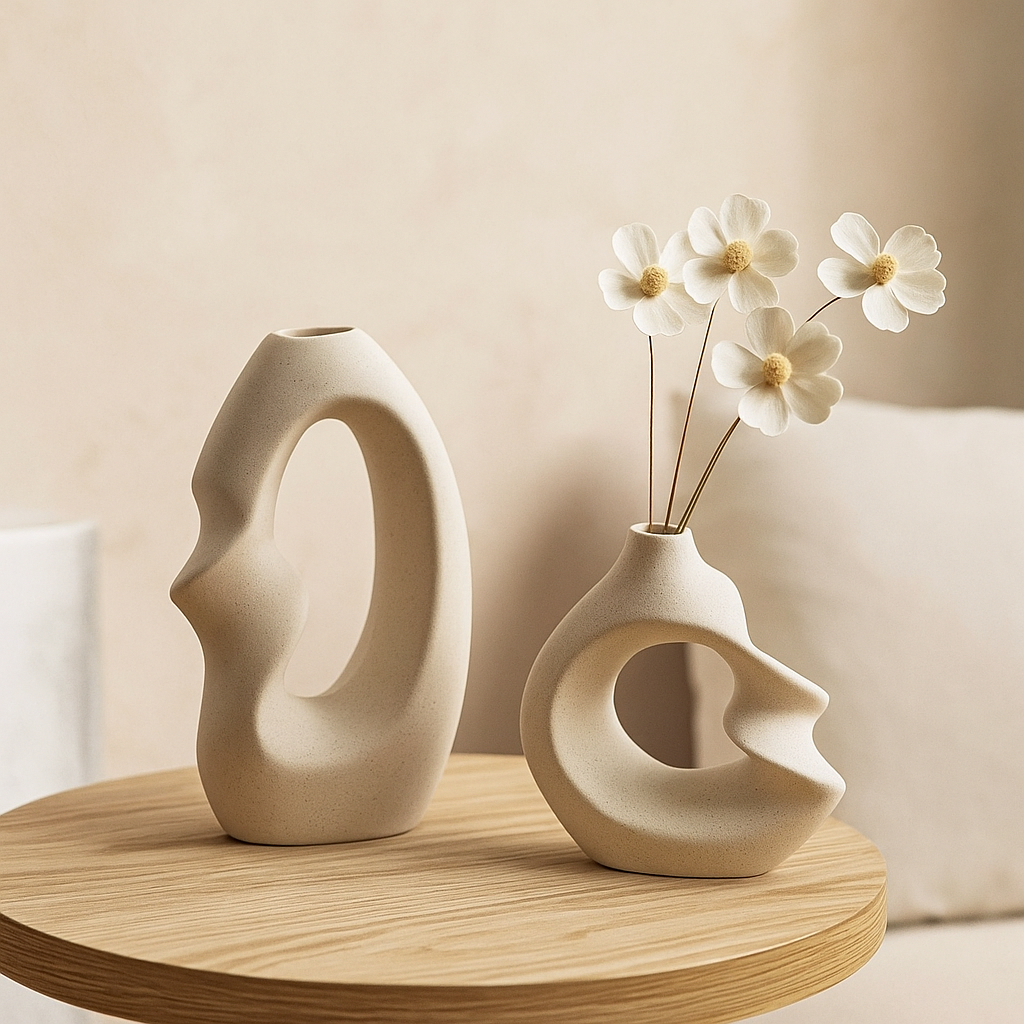 Vi introduserer FormaNova keramiske vasesett, et par moderne vaser som kombinerer kunstnerisk design med funksjonell eleganse. Takket være sine asymmetriske former og skulpturelle estetikk blir disse vasene fengslende midtpunkter og gir et snev av raffinement til ethvert rom. Deres unike silhuett og nøytrale toner gjør at de enkelt kan integreres i ulike innredningsstiler, fra minimalistisk til eklektisk.