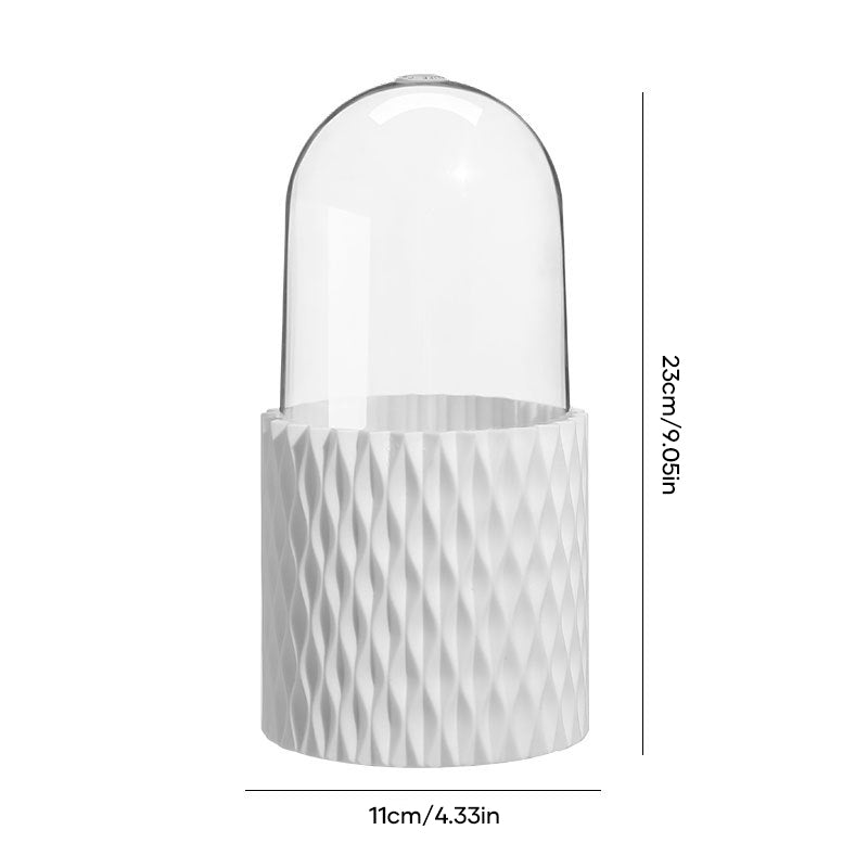 Hold skjønnhetsutstyret pent organisert med GlamSpin - Roterende sminkebørste og kosmetisk organisering. Designet med en klar beskyttende kuppel og flere rom, beskytter den sminkebørstene dine samtidig som den gir god plass til kosmetikk. 360° rotasjon sikrer rask og enkel tilgang til alt du trenger.