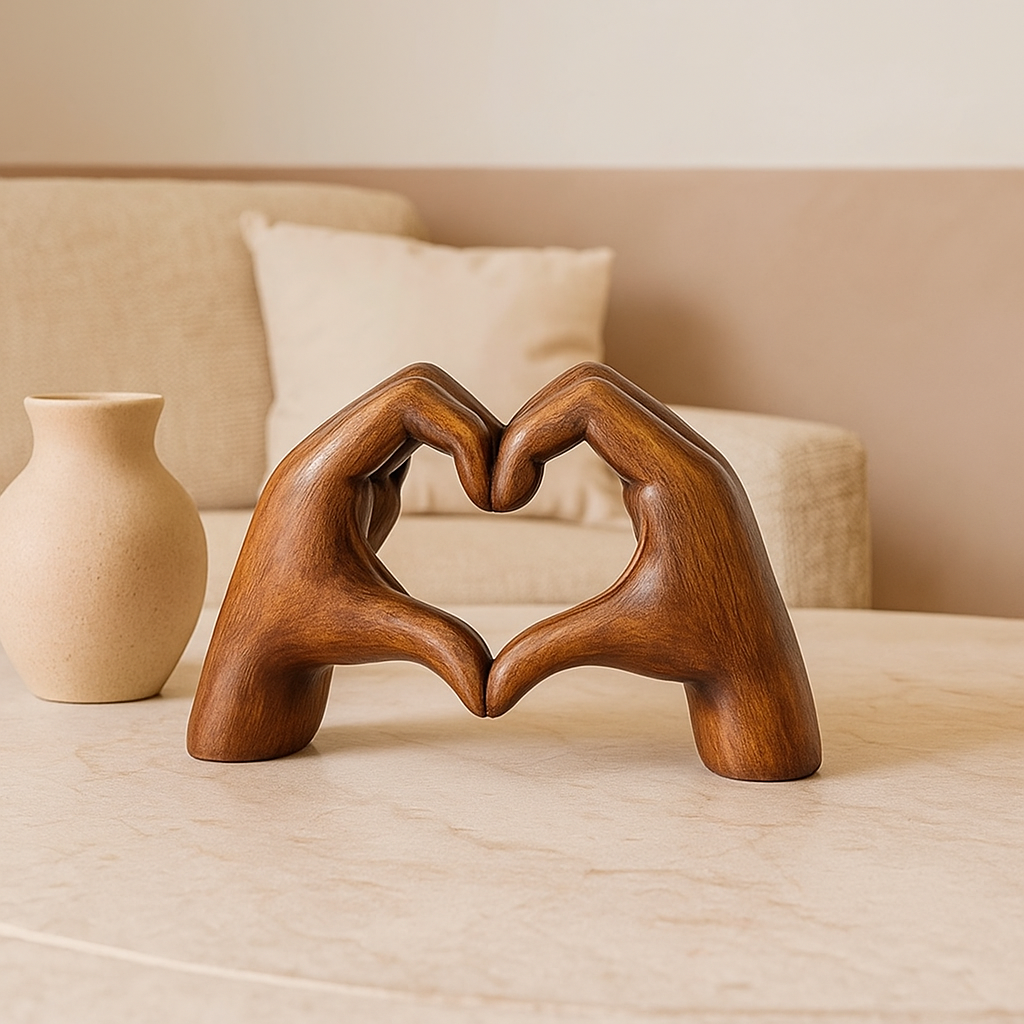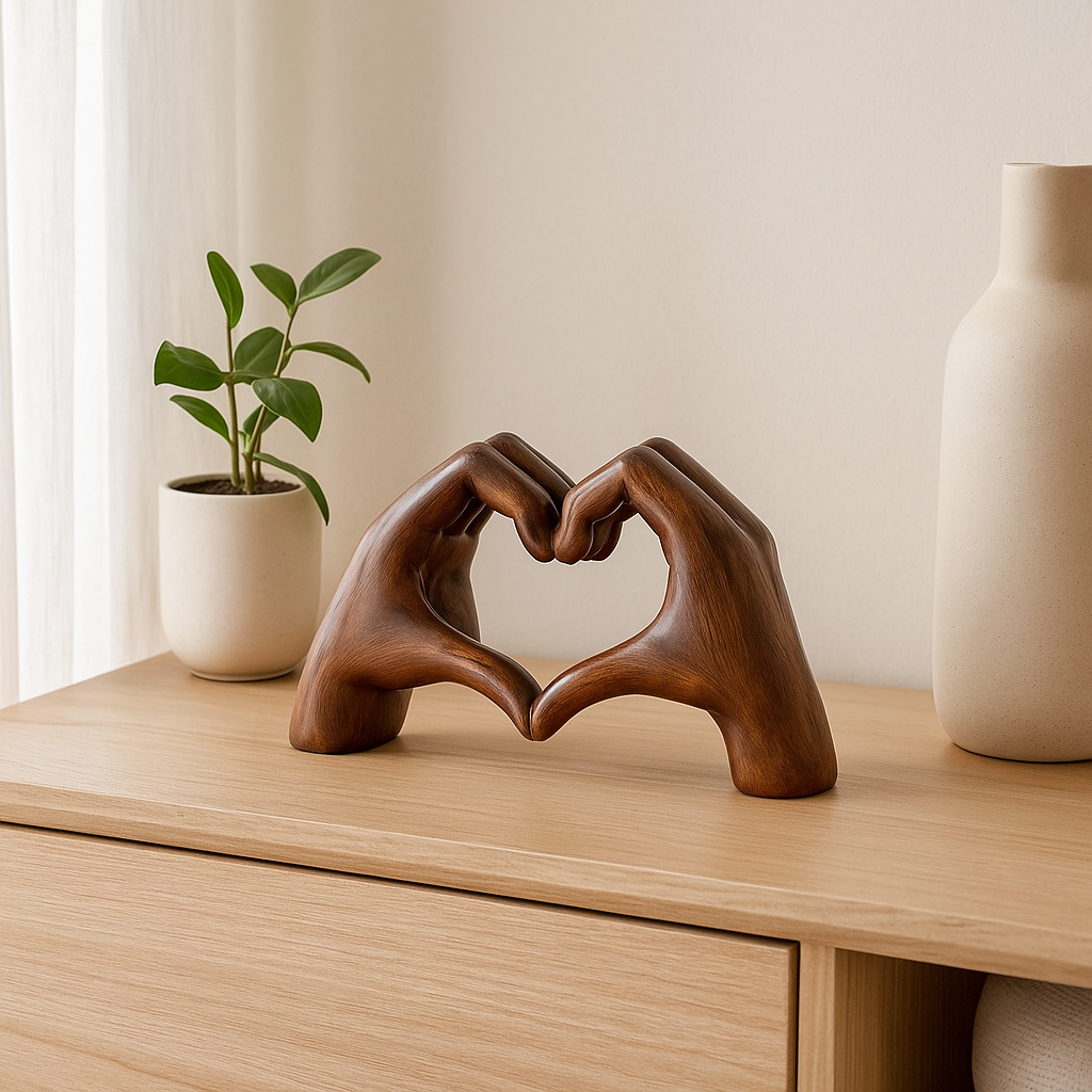 Feir kjærlighetens tidløse skjønnhet med det håndlagde kjærlighetssymbolet fra HeartGlow. Denne elegante skulpturen er nøye utformet for å avbilde to hender som danner et hjerte, som symboliserer forbindelse, medfølelse og emosjonell varme. Enten den plasseres på en hylle, et skrivebord eller en vinduskarm, gir den et meningsfullt og kunstnerisk preg til interiøret ditt.