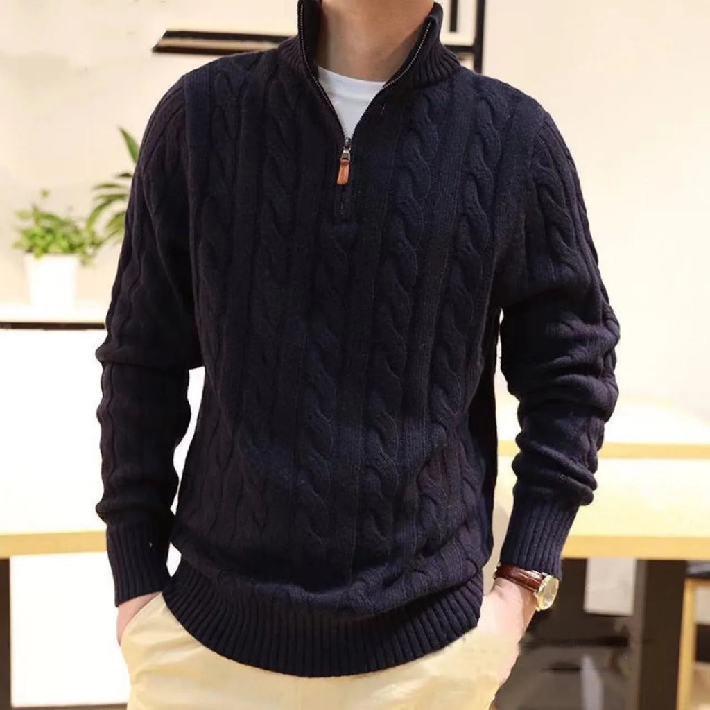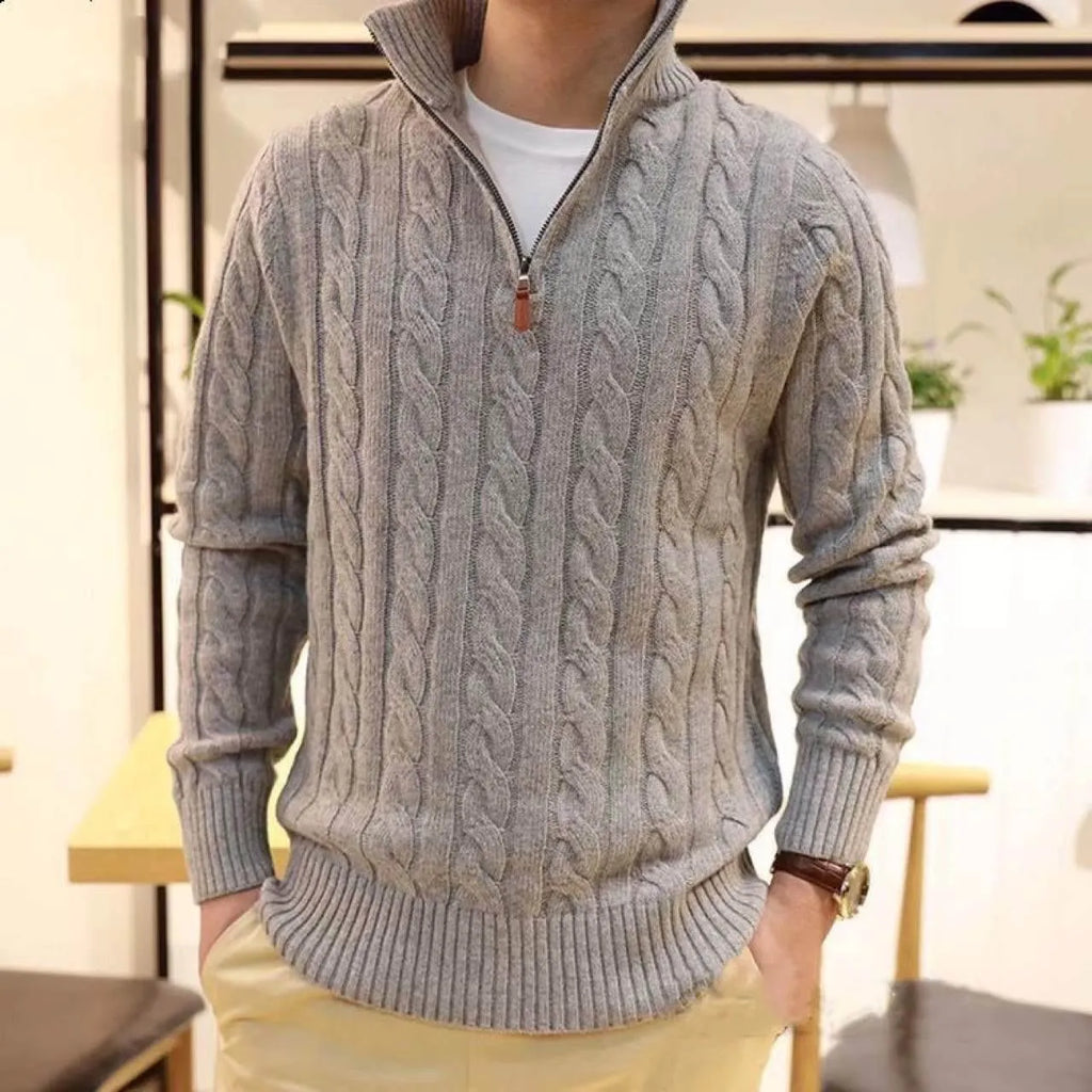 Lucas stilig strikket genser gir en moderne vri på klassisk strikk med sitt unike mønster med halv glidelås. Genseren er perfekt for lag på lag eller som et enkeltstående plagg, og kombinerer varme og stil på en enkel måte. Denne genseren er designet for å skille seg ut, og passer like godt til en uformell dag som til en pyntet kveld.