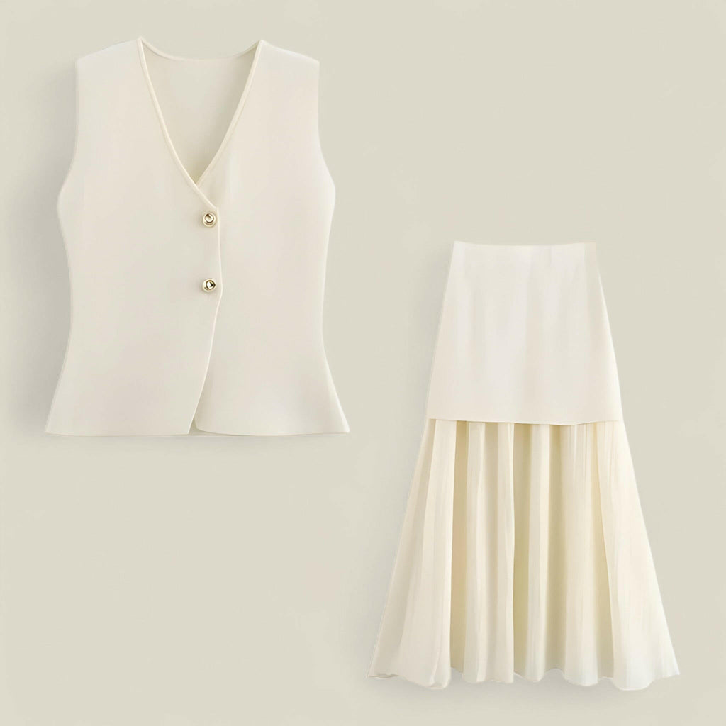 Gi garderoben din et løft med Luna - Elegant todelt sett, som består av en koselig strikket cardigan og et elegant midiskjørt med plisserte plisseringer. Denne tidløse kombinasjonen kombinerer komfort og eleganse på en uanstrengt måte, noe som gjør det ideelt til både uformelle brunsjer og raffinerte kveldsmøter.