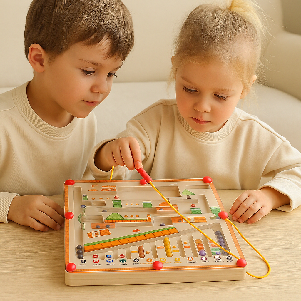 Dette kompakte, rektangulære brettet bruker en magnetisk pinne til å flytte perler gjennom en labyrint, noe som fremmer tallgjenkjenning, hånd-øye-koordinasjon og logisk tenkning. Ideelt for hjemmet eller på farten, tilbyr det en skjermfri aktivitet som støtter tidlig læring på en morsom måte.