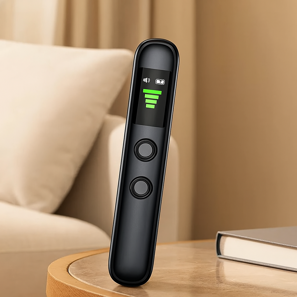 SikkerScan Pro-detektoren er et viktig personlig sikkerhetsverktøy for å oppdage skjulte kameraer, GPS-sporere og trådløse lytteenheter. Enten du er på hotell, på reise eller i sensitive miljøer, beskytter denne kompakte skanneren personvernet ditt takket være avansert RF-signaldeteksjon.