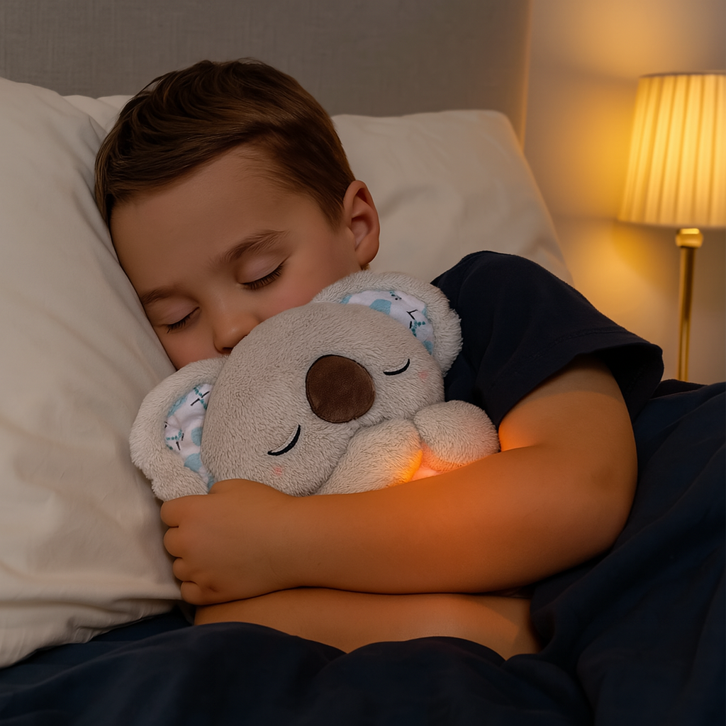 En koselig plysjfølgesvenn med beroligende lyder, mykt lys og rytmisk pust – ideell for å hjelpe barn og voksne med å sovne fredelig.