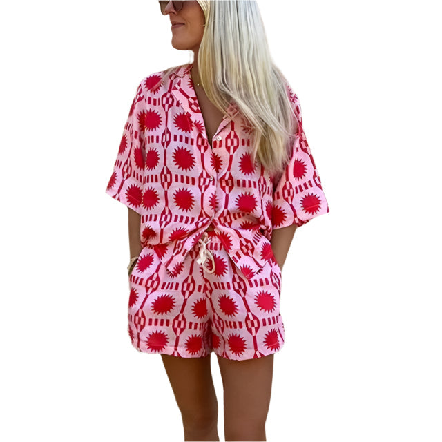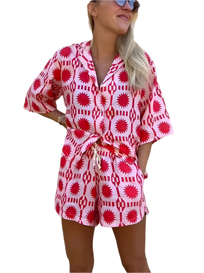 Selma Sommersett i to deler for kvinner er designet for varme dager når du vil føle deg lett, fri og alltid stilig. Med en avslappet topp og matchende shorts får du en komplett sommerlook som både er behagelig å ha på og ser flott ut. Settet er ideelt for ferier, stranddager, kafébesøk eller rett og slett hverdagsbruk i solen.