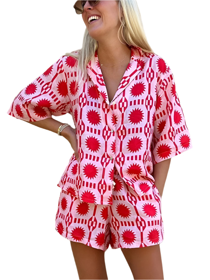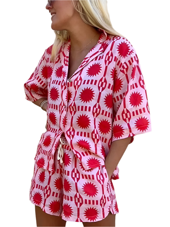 Toppen har en løs, luftig passform med justerbare stropper eller korte ermer (avhengig av variant), mens shortsen har en elastisk linning for optimal komfort. Sammen danner de et harmonisk og feminint antrekk, som enkelt kan styles etter humør og anledning.