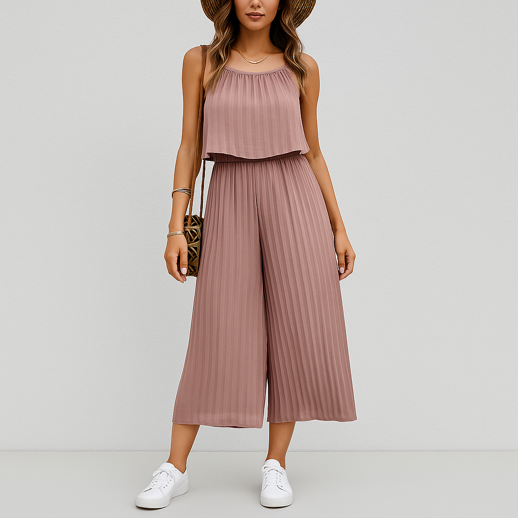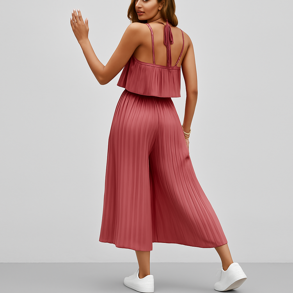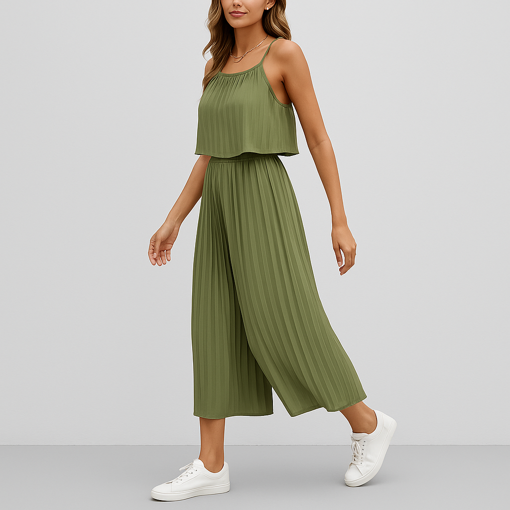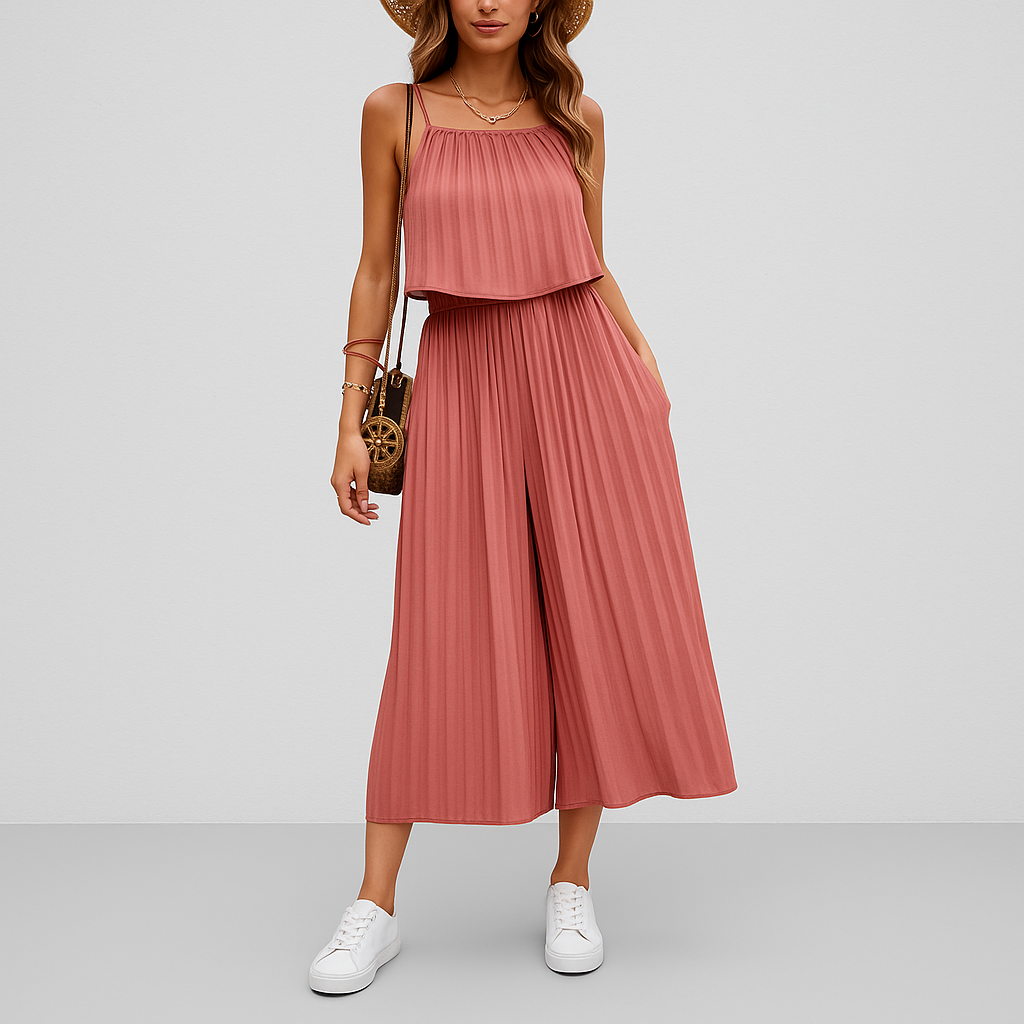 Gå inn i sommersesongen med dette elegante og luftige todelte settet, med en delikat topp med spaghettistropper og et flagrende plissert maxiskjørt. Dette settet er designet for å tilby både eleganse og komfort, og er perfekt for ferier, uformelle utflukter eller solfylte dager. Den minimalistiske silhuetten og den lette følelsen gjør den til et godt valg for å holde seg kjølig og stilig i solen.