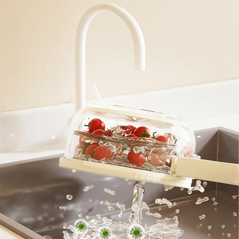 Designet for bekvemmelighet, fungerer det slissede hvite lokket som en spinner og avløp, mens den gjennomsiktige bollen lar deg se produktene dine. Kompakt og stilig, den passer inn i ethvert kjøkken og er enkel å oppbevare når den ikke er i bruk.