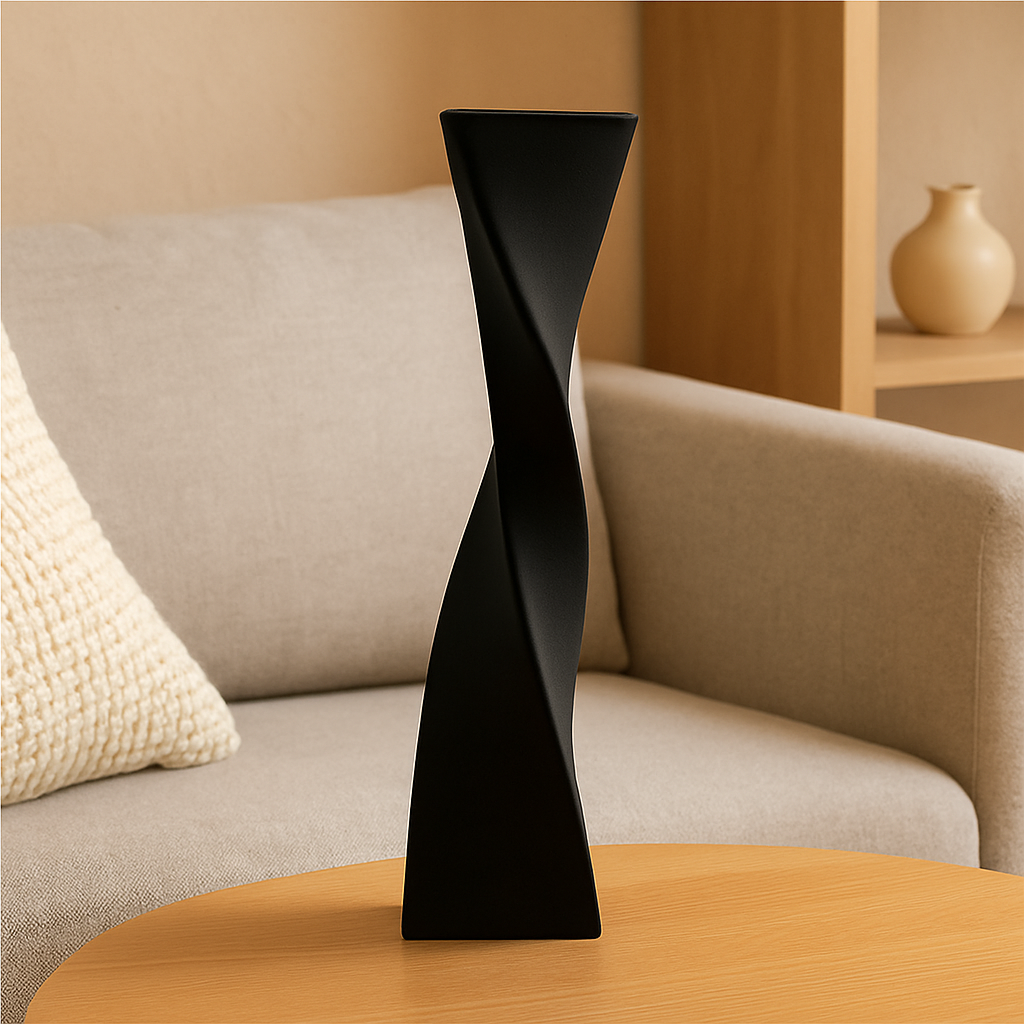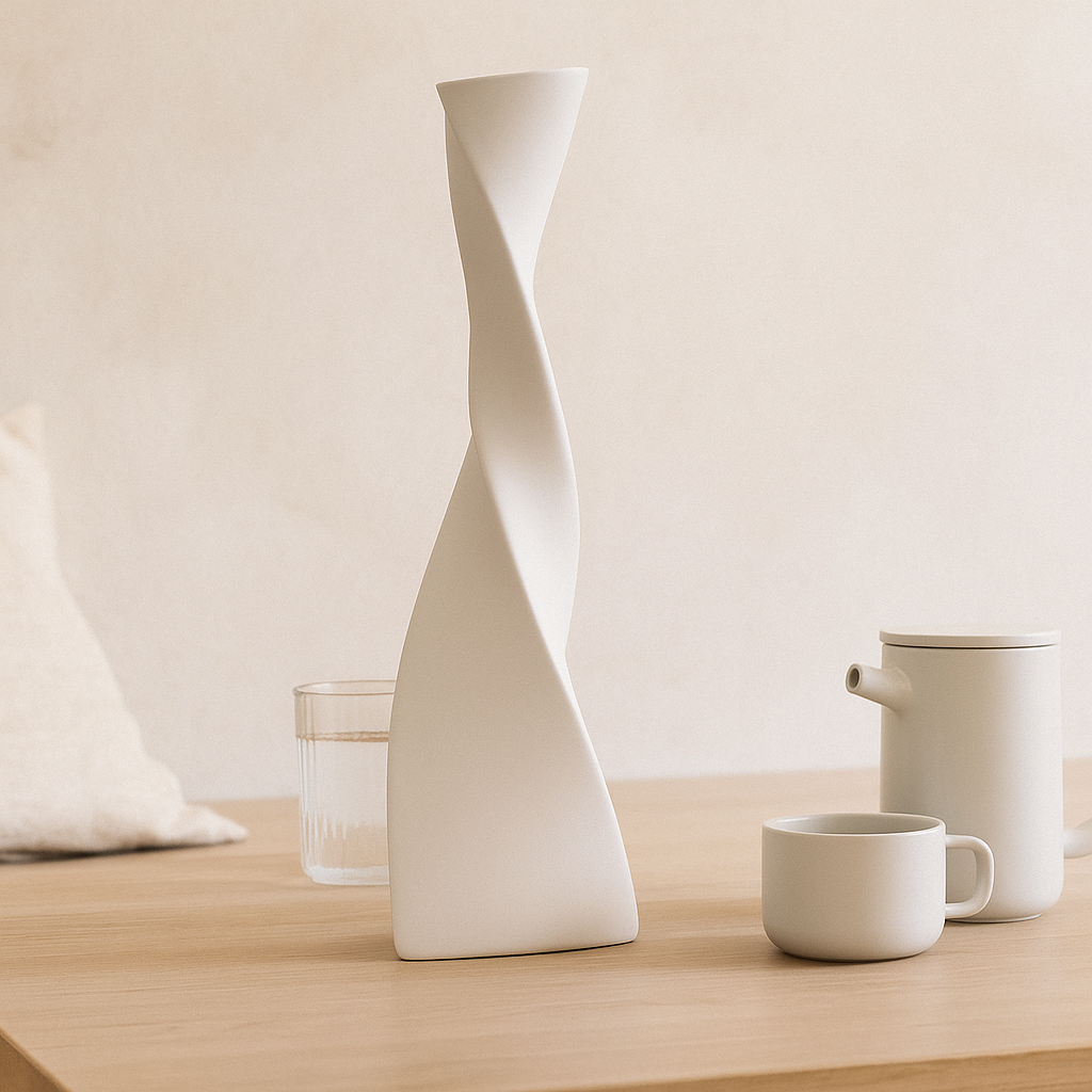 Vi introduserer SpiralElegance keramiske vase, et slående møbel som kombinerer moderne estetikk med kunstnerisk raffinement. Den unike, vridde designen skaper dynamisk visuell interesse, noe som gjør den til et perfekt blikkfang i ethvert moderne oppholdsrom.