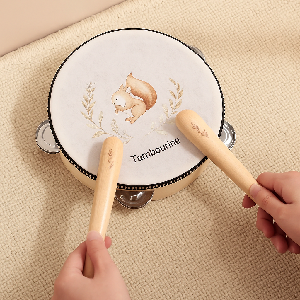 Vekk barnets nysgjerrighet med denne søte tegneserie-trommen i tre. Den er designet for tidlig sensorisk utvikling og rytmisk utforskning. Med en fargerik ekornrangle og håndklokke oppmuntrer dette multifunksjonelle leketøyet til auditiv læring, motorisk koordinasjon og fantasifull lek.