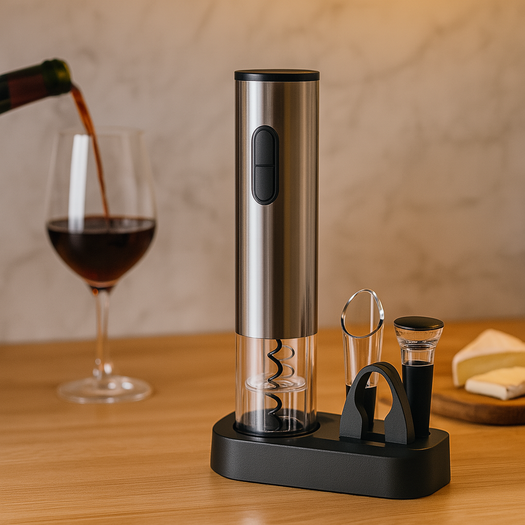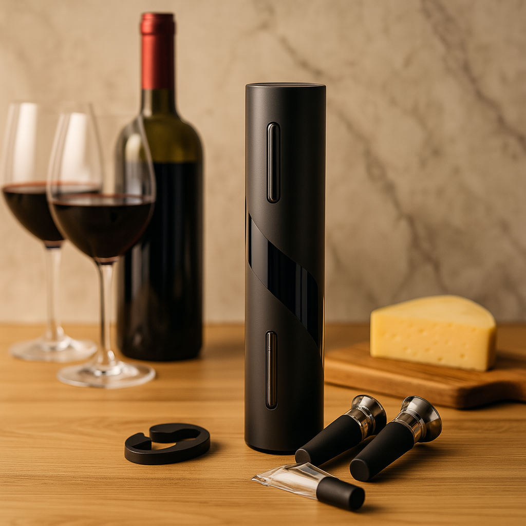 VinoLift er ideell for middagsselskaper, feiringer eller som gave. Den inkluderer en elektrisk korketrekker, en folieskjærer og en USB-ladekabel. Dens moderne, trådløse design passer sømløst inn i ethvert kjøkken eller barområde samtidig som den leverer profesjonell ytelse.